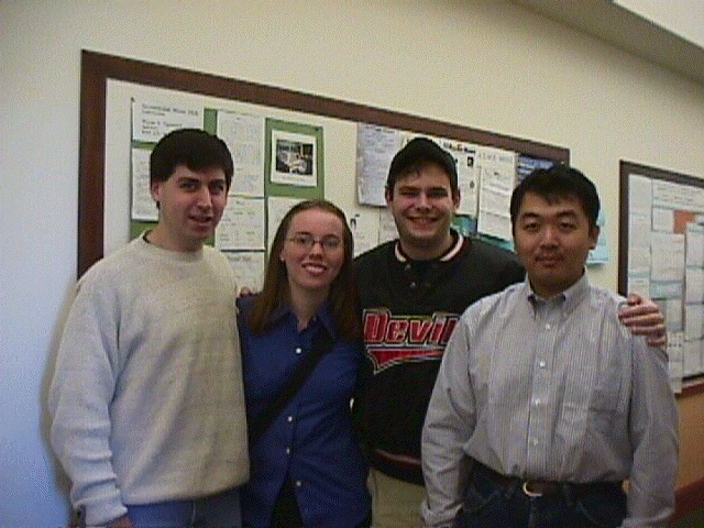 The members of Trinity's team are (left to right) Jamie Mazur '00, Kelly Ward '00, Scott Susslin '01, and faculty adviser, Prof. Chuck Liang.