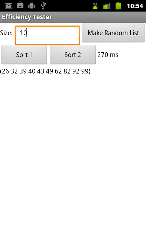 It then provides two buttons, Sort1 and Sort2. One button uses a quadratic sorting algorithm. The other uses a linear sorting algorithm. Each algorithm reports the amount of time in milliseconds that it takes to sort the list. Your job is to figure out which is which and to document your answer.