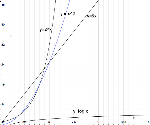 logarithmic << linear << quadratic << exponential log2 x << x << x2 << 2x