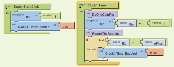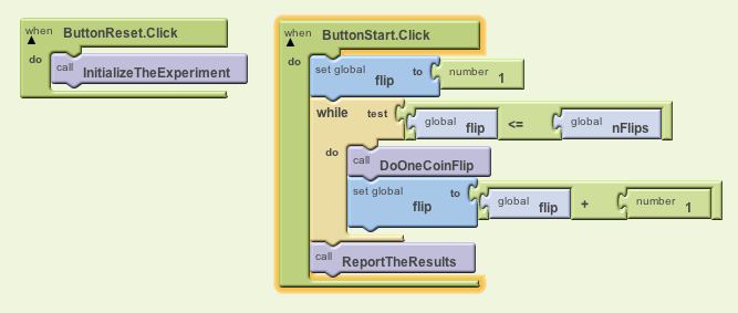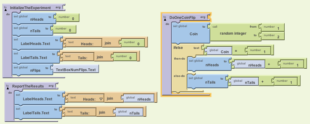 The ReportTheResults procedure just needs to set the labels reporting the number of heads and tails. Notice how we can use the App Inventor join function here to display the number of heads or tails in their respective labels: