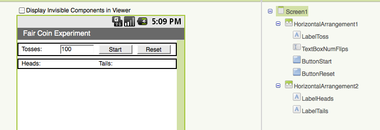 Note that in this app we are not displaying each coin flip, but rather the total number of heads and tails after nFlips coin flips.