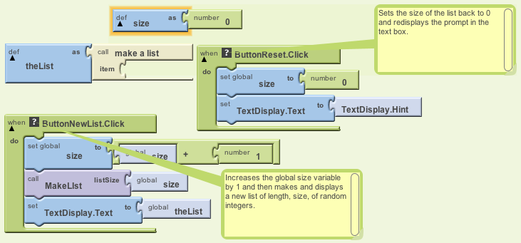 We will use two global variables to keep track of the desired size of the list and theList itself. Each time ButtonNewList is clicked we will add 1 to the size variable, make a list of length size, and display the resulting list. When the ResetButton is clicked, we will simply reset the variables and the text box to their original states.