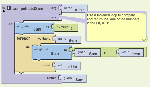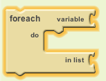 When dealing with lists, App Inventor provides a for-each loop that will perform some operation for each element on the list.