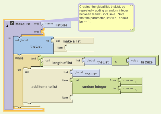 Now let's define the MakeList procedure, using a while loop, which we've used many times before with number problems. Here's the algorithm. Not that it uses a global variable named size to determine the size of the list we are making: