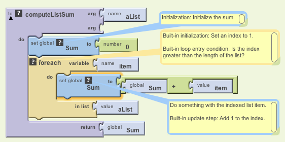 When dealing with lists, App Inventor provides a for-each loop that will perform some operation for each element on the list.
