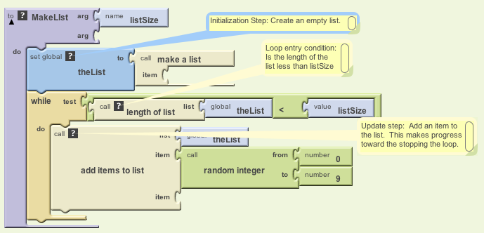 Initialization Step: Before we enter a while loop we need to perform some initializations. In this case we initialize theList to the empty list. And the listSize argument is also initialized to the value given when the procedure is called.