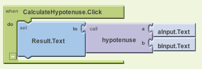 When the CalculateHypotenuse button is clicked, the values in the aInput and bInput text boxes are passed to our hypotenuse function and its result is put in the Result text box.