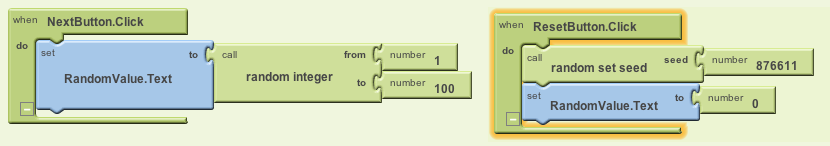 By setting the seed to our magic number, we can fix the behavior of the app to the same sequence of events each time it is restarted. When we no longer want the same sequence, we can "Deactivate" the call to randome set seed by right-clicking on its block.