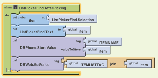 If the retrieval was successful, we set the ListPicker's label to the item name and we call the DBWeb.GetValue procedure to look up a list of those items on DbWeb.