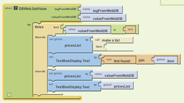 Otherwise, recall from our data model that we are storing a list of lists for each shopping item. So the value returned from the database will be a list. We store it in pricesList and display it in the TextBoxDisplay.