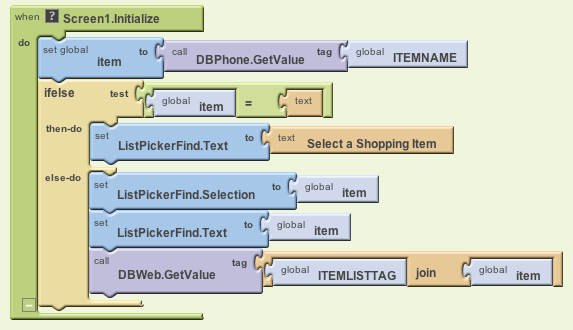 Whenever the user makes a selection from the list picker, we display the selection as the list picker's label, we store their choice under the ITEMNAME tag in DBPhone, the phone's database, and we retrieve the list of items of that type from DBWeb. Again, the DBWeb.GetValue tag is something like "shopping-shoes", where "shoes" is the choice that the user just selected.