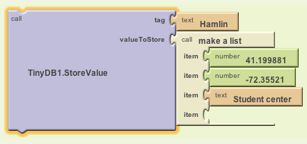 To store a value in a TinyDb, you would use the StoreValue procedure, which takes two arguments, a tag and a value. The tag is always text, but the associated value can be a number, or a string, or even a list.