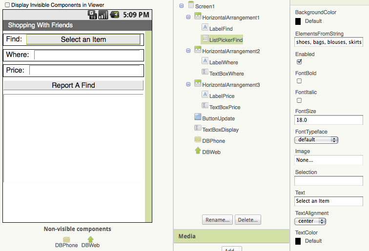 The ShoppingWithFriends app will use a TinyWebDb component to store finds that you and your friends post to the web. It will also use a TinyDb component to remember what you were shopping for the last time you used the app. For this example, we'll only store the name of the item and its price. The user interface will be based on the following design: