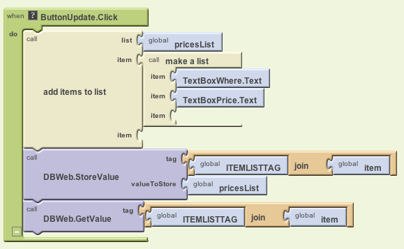 After updating the pricesList, we want to store on the web database with the command DBWeb.StoreValue. Note again how we construct the tag here by joining "shopping-" with the type of item to get something like "shopping-belts".