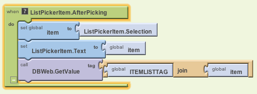 Whenever the user makes a selection from the list picker, we display the selection as the list picker's label, set the global variable item to its value, and look up that type of item on DbWeb. Again, the DBWeb.GetValue tag is something like "shopping-shoes", where "shoes" is the item that the user just selected.