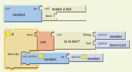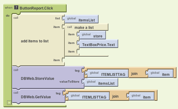 After updating the itemsList, we want to store on the web database with the command DBWeb.StoreValue. Note again how we construct the tag here by joining "shopping-" with the type of item to get something like "shopping-belts".
