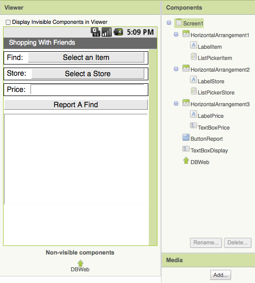 Let's suppose you and your friends are going shopping at the mall and want to keep in touch and share your "finds" -- bargains, cool stuff, etc. The ShoppingWithFriends app will use a TinyWebDb component to store finds that you and your friends post to the web. For this example, we'll only store the name of the item, what store it was found at and its price.