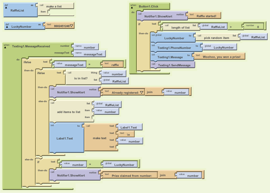 Users are invited to text the word "raffle" to the app's phone number. They are then registered in the RaffleList. When all participants are registered, the Lucky Lotto button is clicked and one of the registered phone numbers is chosen at random to receive a prize.