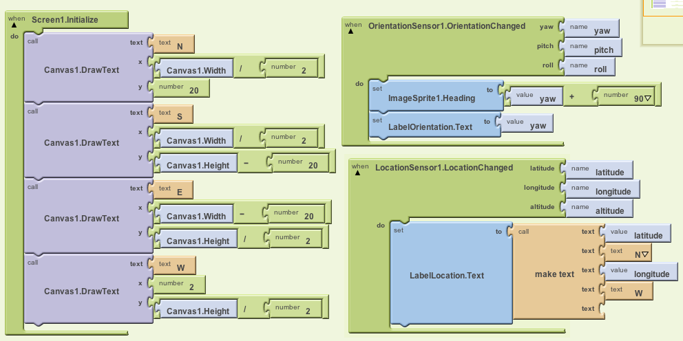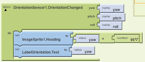 The yaw value will be 0 degrees when the top of the phone is pointing due North. On the other hand, the ImageSprite will be 0 degrees when it is pointing toward the right edge of the screen. To adjust for this difference, we want to add 90 to the yaw and make this the direction that the arrow points. We also want to display the yaw value on the LabelOrientation.