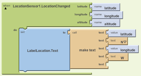 If time permits, add a block that will display the phone's location on the LabelLocation label. Find the when LocationSensor.LocationChanged block and add code to it that will simply set the label to the sensor's latitude and longitude. It should look like this: