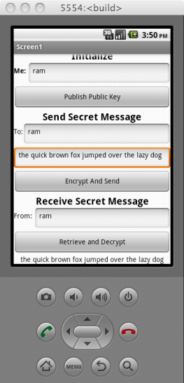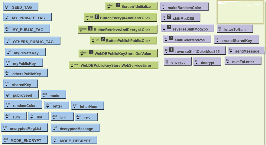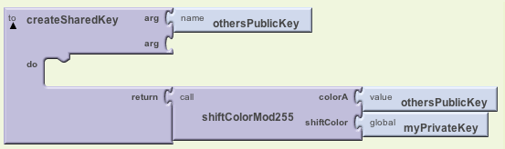 This app implements a simple cipher system that allows Alice and Bob to communicate "securely" using a shared secret key. The color-based Diffie-Hellman Key Exchange method is used to create the shared key. Messages are encrypted as strings of colors using a simple substitution cipher. Alice's and Bob's public keys are stored on a "public key server", implemented with a TinyWebDb. Messages are transmitted through the TinyWebDb.