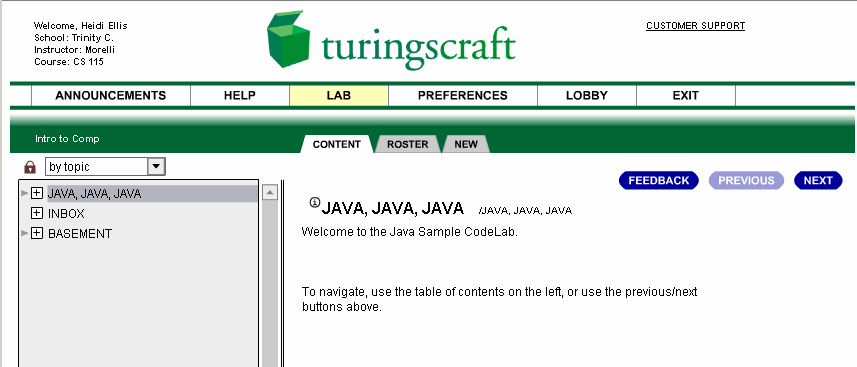 - Expand the JAVA, JAVA, JAVA section by clicking on the plus sign (+) in front of the JAVA, JAVA, JAVA heading. The JAVA, JAVA, JAVA section should now contain at least two subsections, the first of which is Intro to CodeLab.