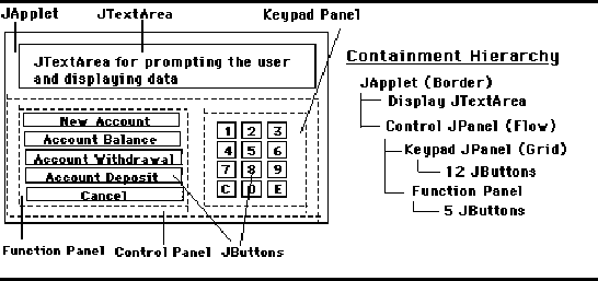 The demo applet consists of a JTextArea that is used as the ATM's display screen. It displays all I/O during an ATM session. The only other interface components are the 12 keypad and 5 function JButtons. The demo uses several JPanels to achieve its overall layout (Figure 2). First there is a main panel that contains all of the interface components. It uses a BorderLayout with the machine's display in the center and the keypad and function pad at the south edge. The function pad and keypad are organized into separate panels and arranged as GridLayouts. Finally, a fourth panel is used to group the two collections of buttons so that they may be added to the south area of the main panel.