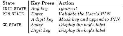 The most difficult state transition occurs between the PIN_STATE and the GO_STATE, because it is here that the user's PIN must be checked for validity. What complicates this task is that the keypad must be used to enter the PIN. Therefore the processKeyPad() method must check the machine's state in order to know how to process the number keys. There are three possible states, whose actions can be identified by the following table: